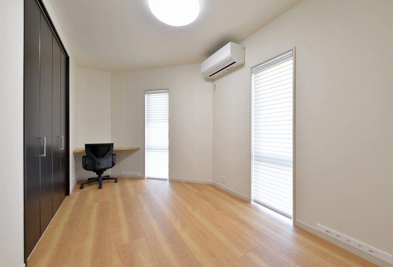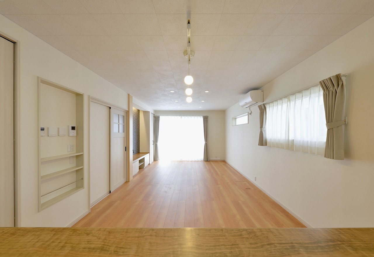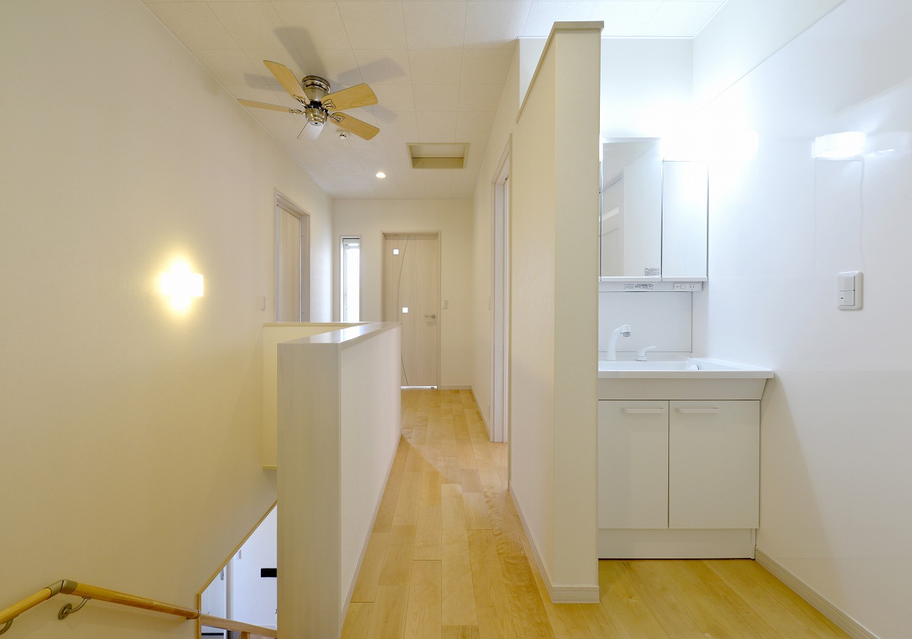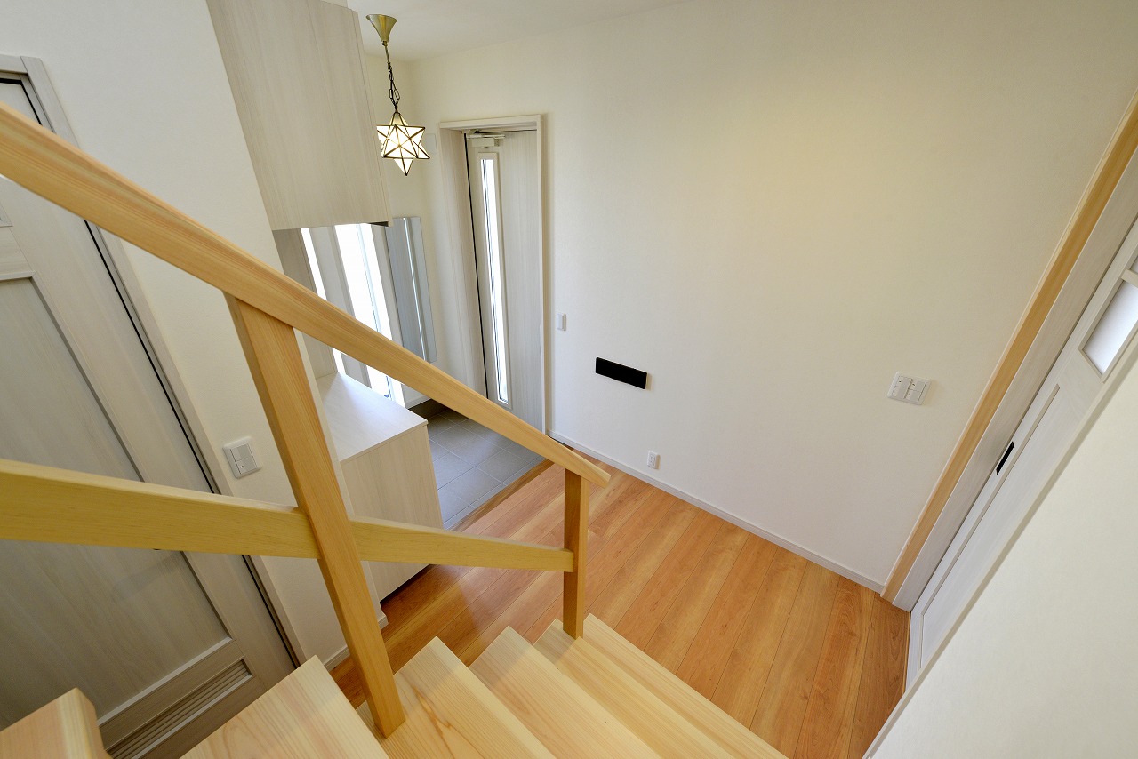 一階床暖房 角地ではあるが敷地を最大限有効活用するために、敷地に沿った造りにした。ベランダを広 めに取り街中の住宅地であっても採光をとれるよう工夫した。