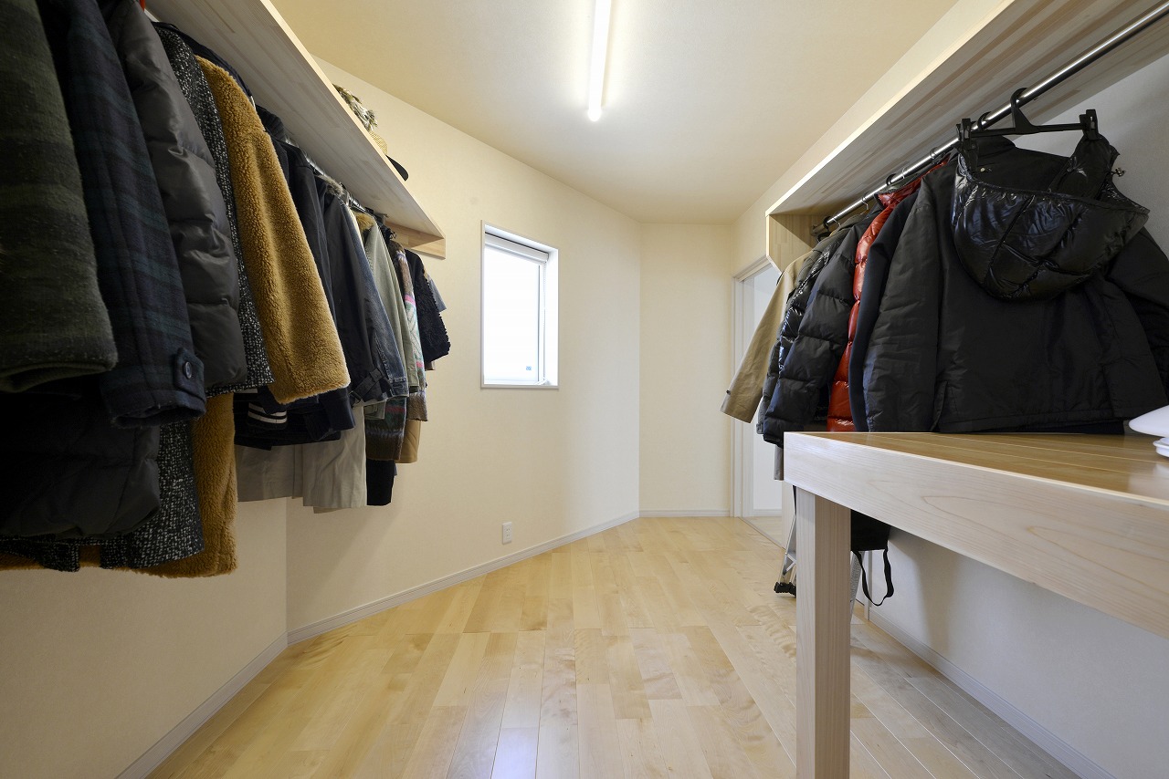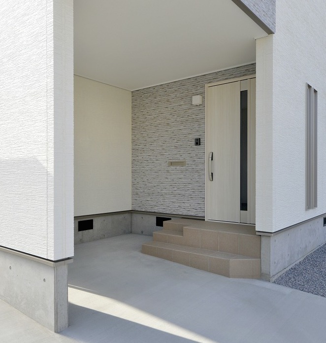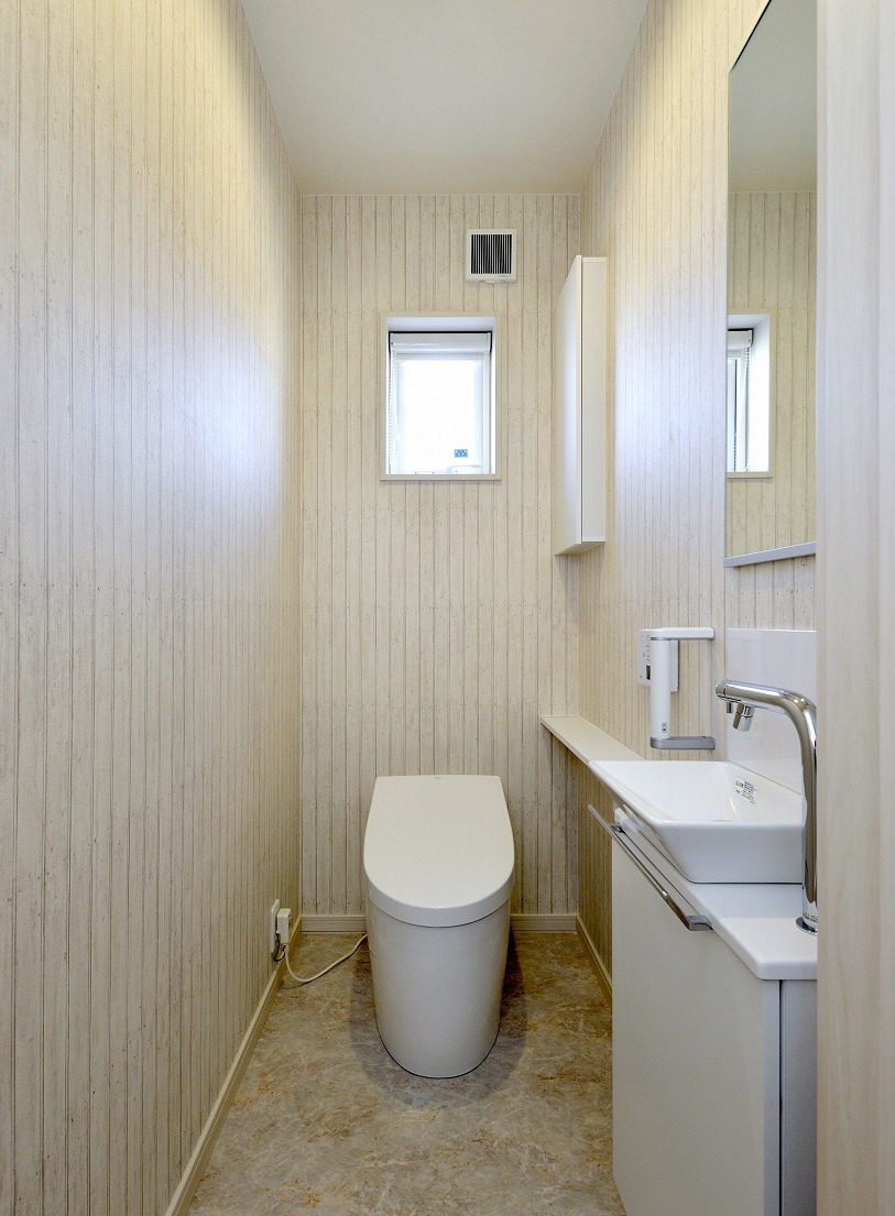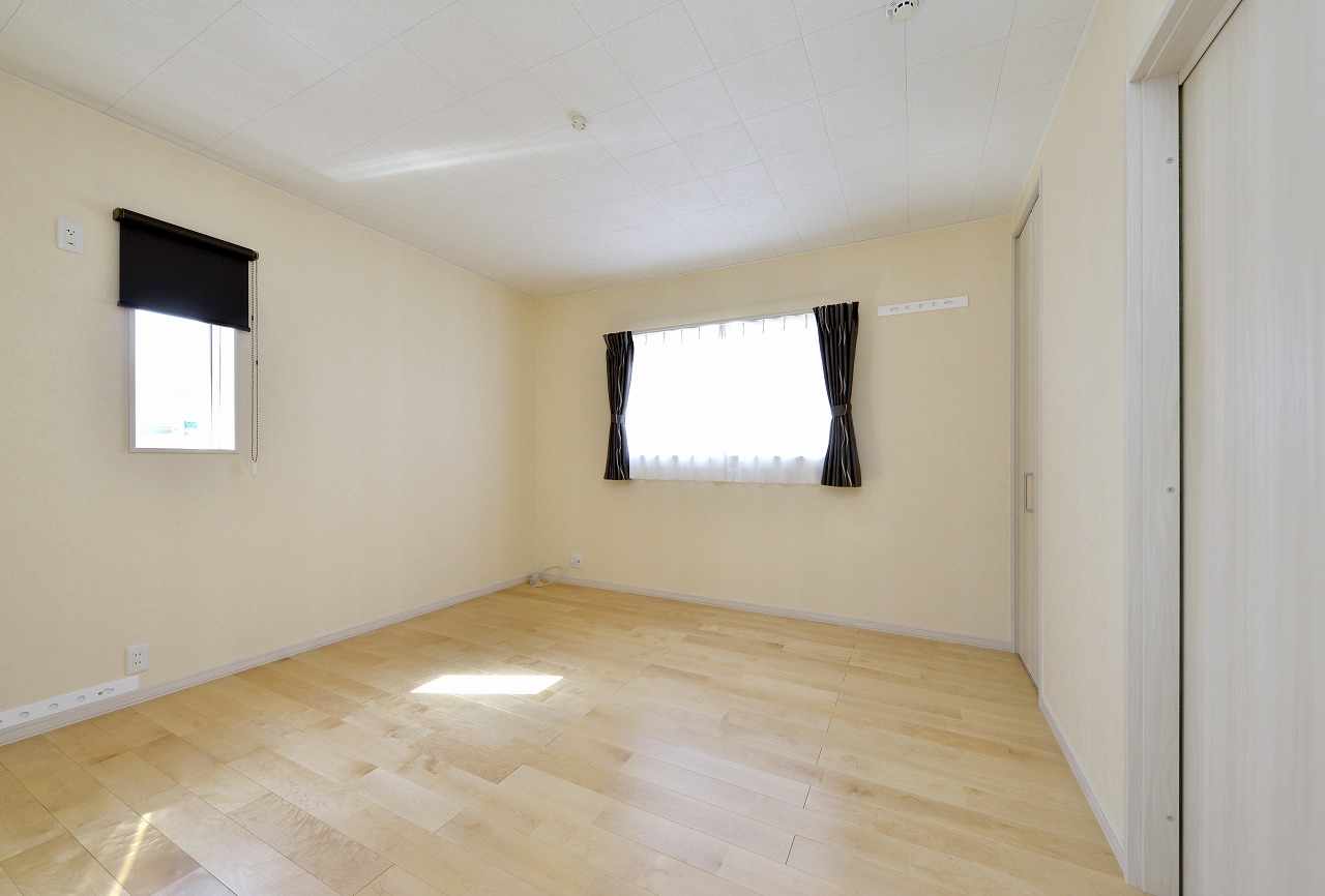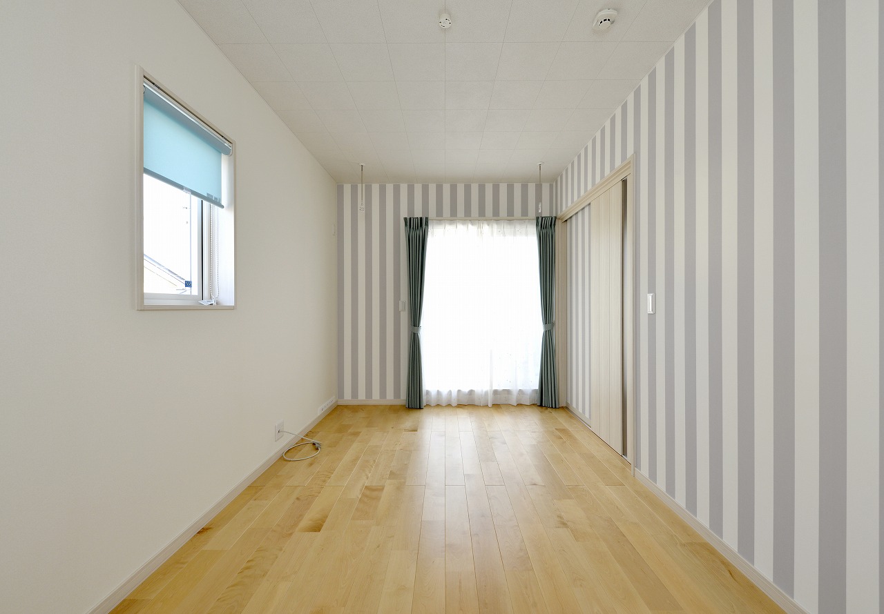 一階床暖房 角地ではあるが敷地を最大限有効活用するために、敷地に沿った造りにした。ベランダを広 めに取り街中の住宅地であっても採光をとれるよう工夫した。