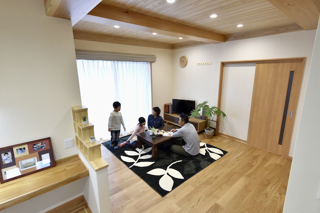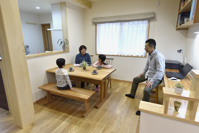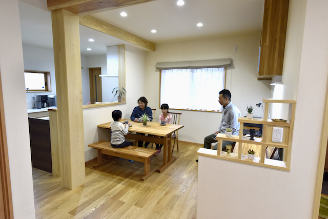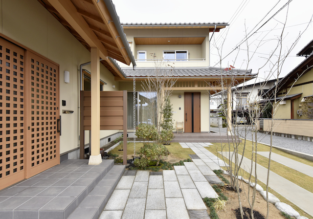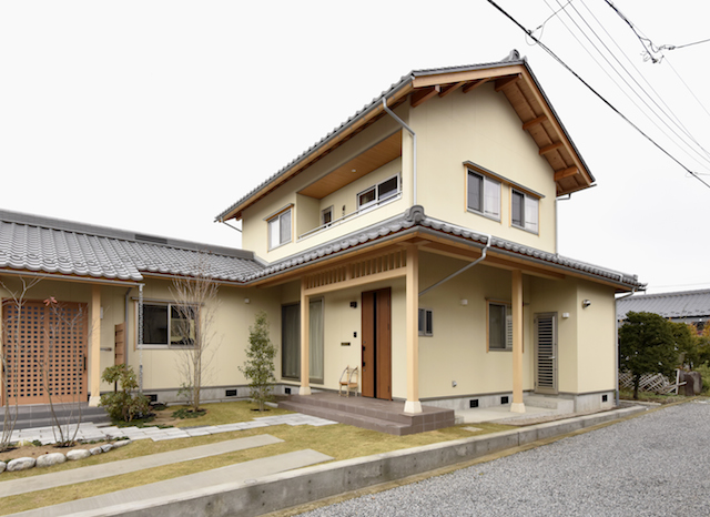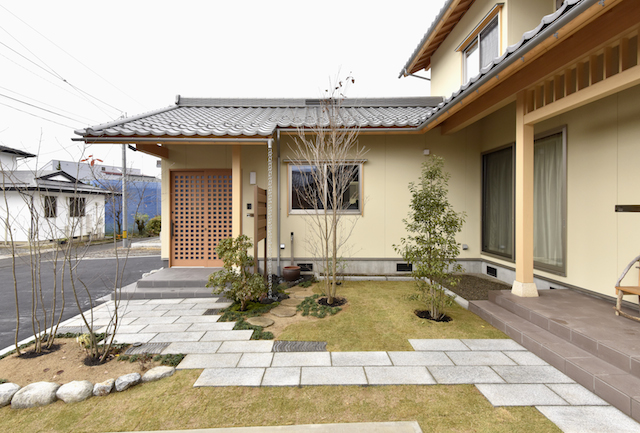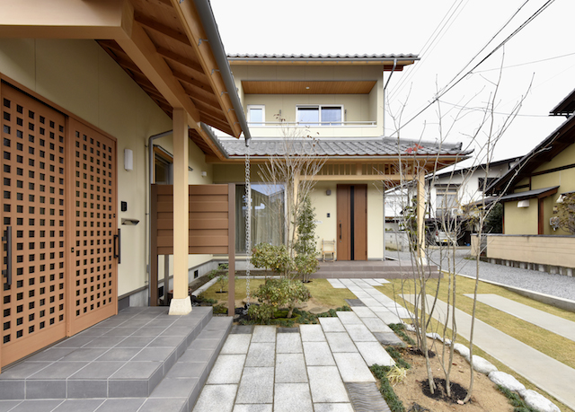 事務所併用住宅 外観は和風にこだわった。屋根にもこだわり化粧垂木を使い和風に仕上げた。事務所と住宅 の動線が重ならないよう工夫した。