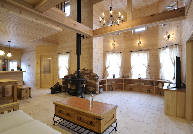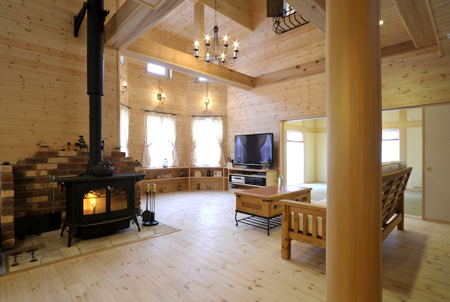 薪ストーブ 北欧をイメージした外内観。室内は壁・床・天井全面無垢板張り。随所に梁を見せ一部丸太 梁を使用。吹き抜けを造ることにより高さも出した。