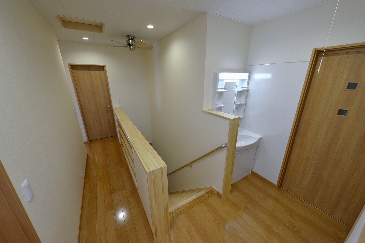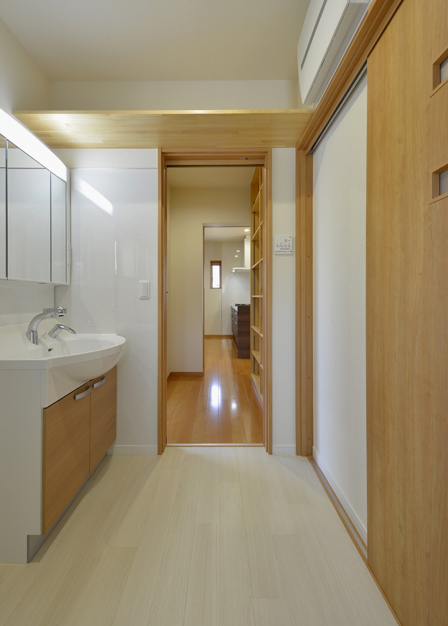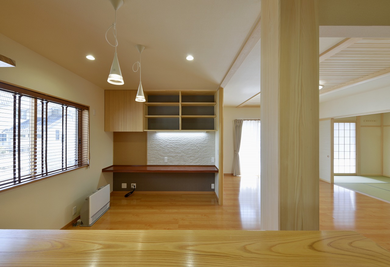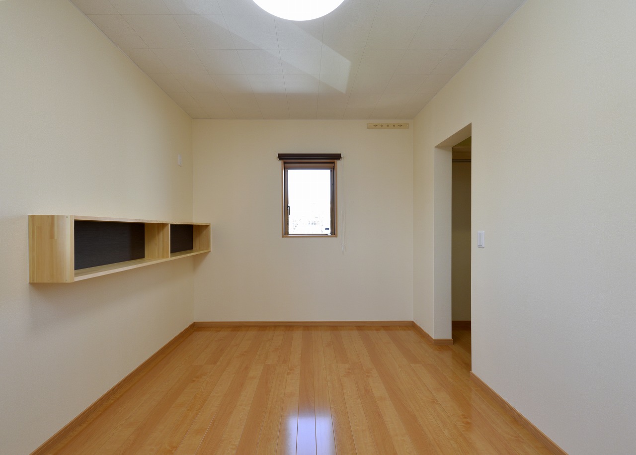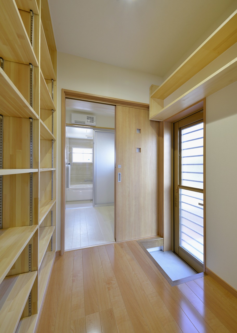 ガスヒーター 随所に作り付けの棚を設置し、収納を考えた造りにした。